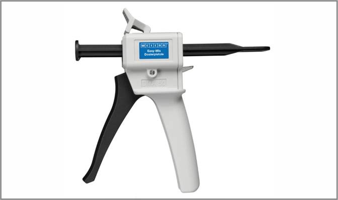 Verarbeitung von Easy-Mix Klebstoffen Die WEICON Dosierpistole Easy-Mix D 50 ist sehr robust und bruchfest